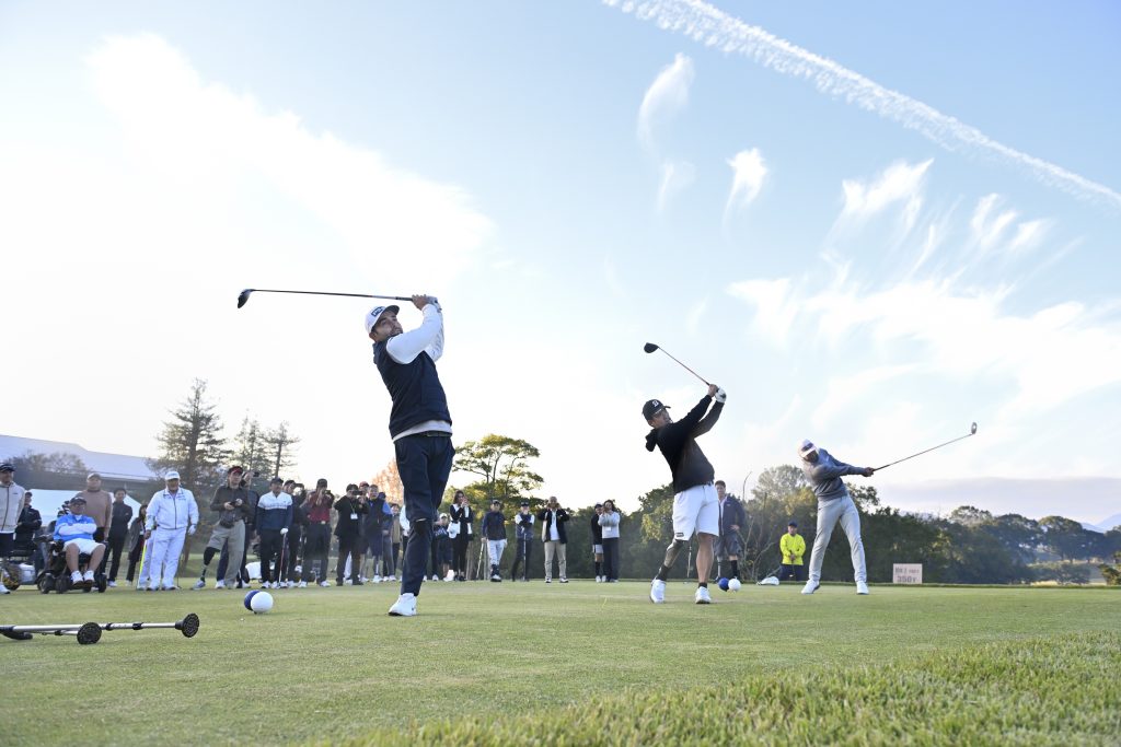 大会初日は快晴のゴルフ日和。スタート前のデモプレーでは、スペインのホアン・ポスティゴ選手、チリのエルナン・ガルシア選手、そして日本の吉田隼人選手が強打を披露し、ギャラリーを沸かせました。